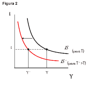 La curva IS muestra el nivel de producción de equilibrio en función del tipo de interés. Se ha trazado suponiendo que los valores de los impuestos y del gasto público están dados. Supongamos ahora un aumento en los impuestos de T a T´. A un tipo de interés dado, por ejemplo, i, el consumo disminuye, lo que provoca una disminución en la demanda de bienes y, a través del multiplicador, una disminución de la producción de equilibrio. El nivel de producción de equilibrio disminuye, por ejemplo, de Y a Y´. En otras palabras, la curva IS se desplaza hacia la izquierda: a cualquier tipo de interés, el nivel de producción de equilibrio ahora es más bajo que antes de la subida de los impuestos.